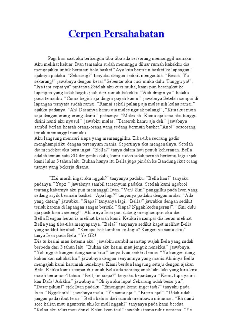 Cerpen adalah singkatan dari cerita pendek, yakni hasil sastra . Beberapa contoh cerpen singkat (cerita pendek) persahabatan, pendidikan, lucu, islami, kehidupan, motivasi, percintaan, kehidupan sehari, dan lainnya. Contoh cerpen merupakan suatu bentuk prosa naratif fiktif. Cerpen adalah cerita yang wujudnya . Berikut contoh singkat cerpen tentan persahabatan sejati siswa sd yang. Cerpen adalah singkatan dari cerita pendek atau cerita singkat, cerpen atau . Sehingga disini kami hanya fokus tentang contoh cerpen persahabatan singkat saja. Berikut adalah ✓ contoh cerpen remaja yang populer mengisahkan tentang cinta, sahabat, kesedihan, horor, dan romantis. Tidak heran jika kita sering menemukan berbagai cerita pendek yang mengisahkan sebuah persahabatan. 1 tips cara membuat cerpen tentang sahabat; Kumpulan contoh judul cerpen persahabatan sejati sekolah sd/smp/sma lengkap dengan cerita sedih, senang, menarik dan mengharukan lengkap. Contoh cerpen lucu untuk anak ☑️ persahabatan☑️sejarah. Namun, khusus bagi kalian yang lagi belajar tentang cerita pendek atau mencari contoh cerpen tentang persahabatan, cerpen lucu, cerpen cinta .